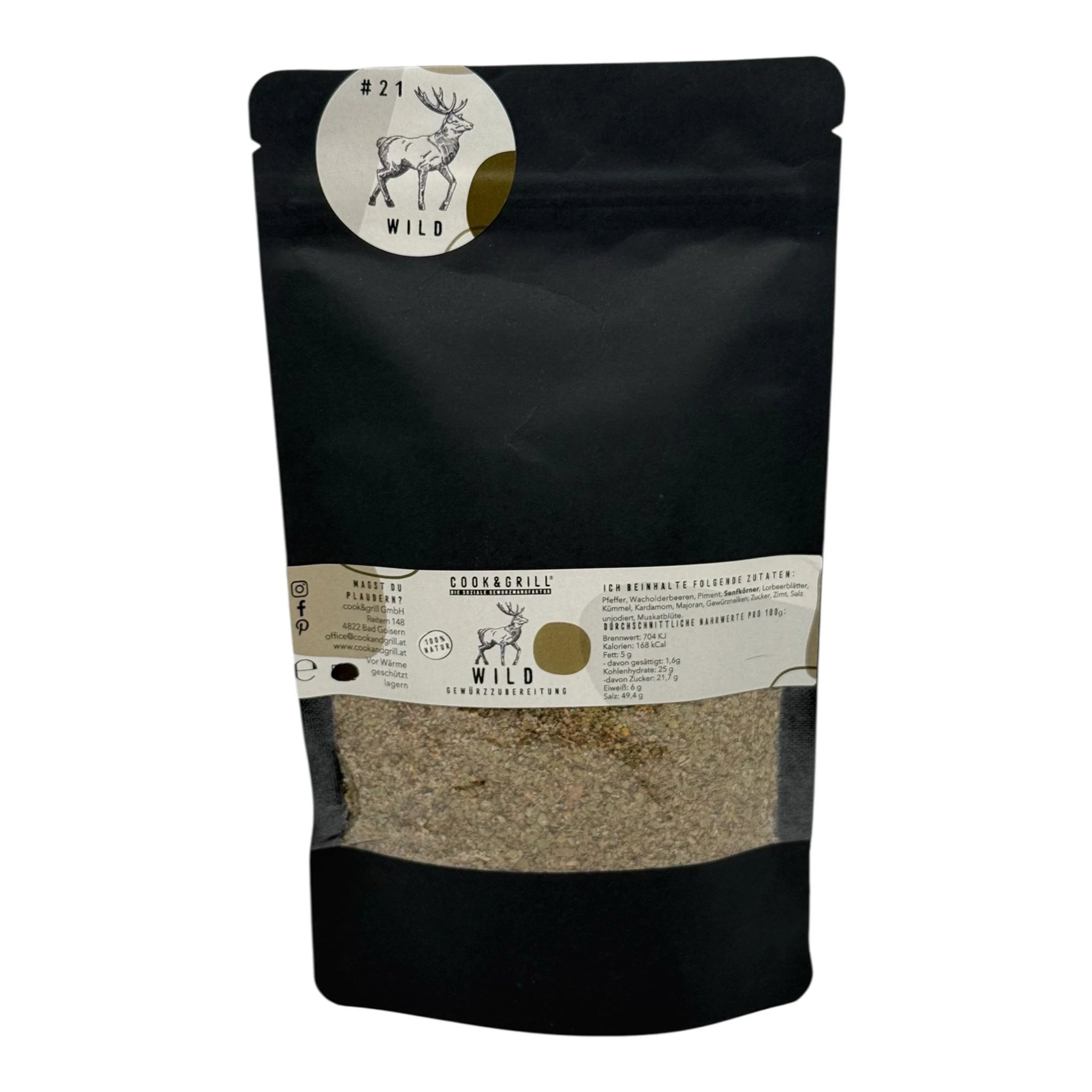Das Wildgewürz von Cook & Grill ist eine aromatische, sorgfältig abgestimmte Gewürzzubereitung, die speziell für Wildgerichte entwickelt wurde. Mit einer harmonischen Mischung aus Pfeffer, Wacholderbeeren, Kräutern und traditionellen Gewürzen ergänzt es den kräftigen Geschmack von Reh, Hirsch, Wildschwein oder Federwild auf perfekte Weise. Hergestellt aus natürlichen Zutaten ohne künstliche Zusatzstoffe bietet dieses Gewürz einen tiefen, herzhaften Geschmack – inspiriert von klassischer Jagdküche und moderner Kochkultur. Anwendung Das Wildgewürz eignet sich hervorragend für: Rothirsch, Reh, Wildschwein, Federwild Wildragout, Braten, Steaks und Gulasch Marinaden, Jus und Sauce Wildburger, Wildbratlinge Es kann direkt vor dem Braten oder Grillen eingerieben, in eine Marinade eingerührt oder zum Abschmecken von Saucen und Fonds verwendet werden. Vorteile: Warum Wildgewürz von Cook & Grill? Perfekt abgestimmt auf Wild: Spezialmischung, die die natürlichen Fleischaromen elegant unterstützt. Vielseitig einsetzbar: Ob Grill, Pfanne oder Ofen – für klassische und moderne Rezepte. 100 % natürliche Zutaten: Ohne künstliche Zusatzstoffe oder Füllstoffe. Einfach in der Anwendung: Kein Vorbereiten oder Mischen nötig – direkt aus dem Glas. Geschmackserlebnis: Ausgewogene Balance aus Würze, Kräutern und herzhaften Noten für ein vollmundiges Aroma.