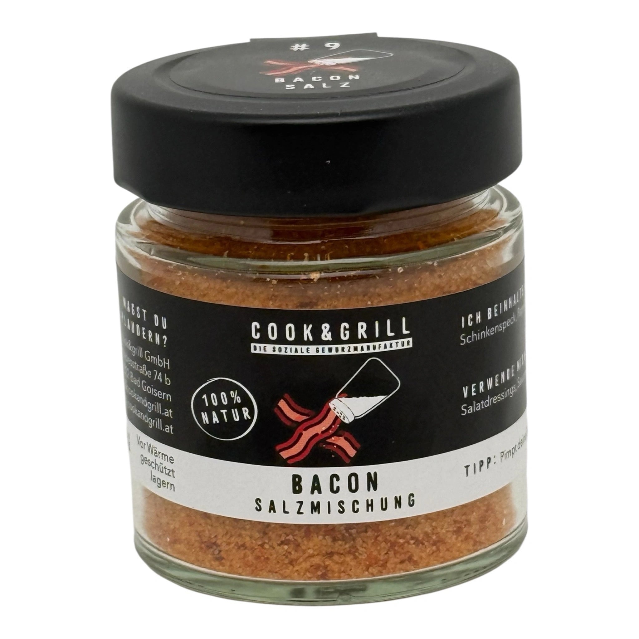 Das Specksalz von Cook & Grill ist eine aromatische Salzmischung mit intensivem Bacon-Geschmack. Hochwertiges Salz wird mit fein abgestimmten Specknoten kombiniert und sorgt für eine herzhafte, rauchige Würze. Ideal für alle, die Speisen unkompliziert eine deftige Grill- und Bacon-Note verleihen möchten – ganz ohne zusätzliches Anbraten von Speck. Vorteile auf einen Blick Intensiver Bacon- und Raucharoma-Geschmack Vielseitig einsetzbar für Grill & Küche Ergiebige Salzmischung Einfaches Würzen ohne zusätzlichen Speck Hochwertige Qualität von Cook & Grill 100 % Genuss für Speckliebhaber Anwendung Vielseitig einsetzbar in Küche und am Grill: Fleisch: Steak, Burger, Ribs, Geflügel Kartoffelgerichte: Bratkartoffeln, Pommes, Wedges Eier & Frühstücksgerichte: Rührei, Spiegelei Gemüse & Pilze Dips, Butter, Saucen und Salatdressings Kann sowohl vor dem Garen, währenddessen als auch zum Nachwürzen verwendet werden.