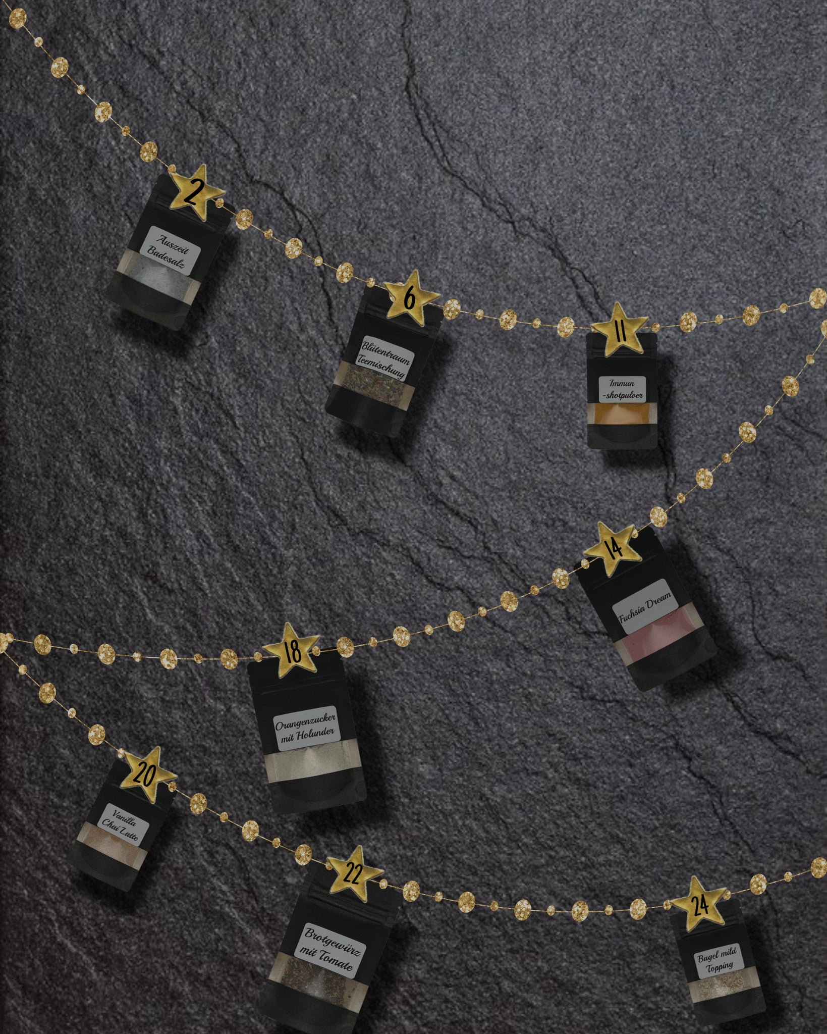 24 Gewürzbeutel, 24 Sticker zum selber kleben 24 Klammern inkl. 2 Meter Band.